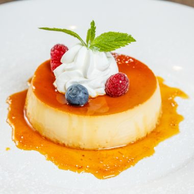 Creamy, Mexican custard, rich caramel sauce, blueberries, raspberries, whipped cream.