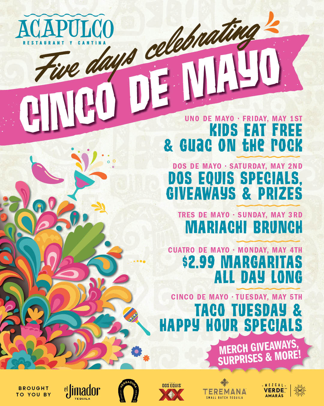 Join us for five days of can’t-miss deals, festive vibes, and daily celebrations leading up to Cinco de Mayo. From family-friendly offers to margaritas, mariachi, and tacos—there’s something every day.