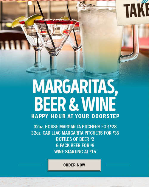 Happy hour at your doorstep! 32oz House margarita pitchers for $28. 32oz. Cadillac margarita pitcher for $35. Bottles of Beer $2. 6-Pack beer for $9. Wine starting at $15.